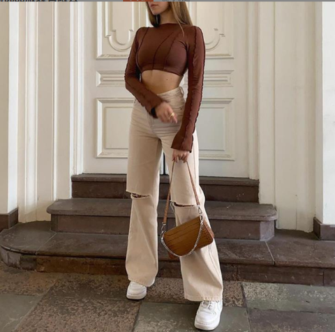 Casual Breathable Denim Solid Ripped Straight-leg Jeans for Women Fashion