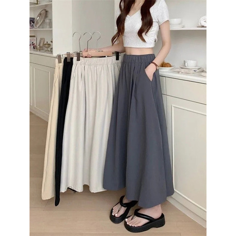 Autumn New A-Line Mid-Length Skirt High Waist Loose Slimming Pleated Solid Color Elasto XS Natural Plain Dyed Summer